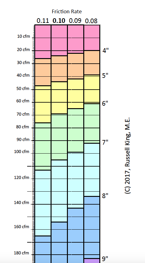 In the diagram above or to the right, depending on your screen size, notice that at a friction rate of 0.11, a 6″ duct (yellow) will deliver up to 77 cfm.  At a friction rate of 0.08 it will only deliver 61 cfm.  In other words, if you needed to deliver 70 cfm to a room, you could use a 6″ duct if the run was shorter and the friction rate was less than 0.10, but if the friction rate was 0.09 or lower, you would need a 7″ duct (green).  Also notice that at 80-90 cfm the friction rate can be anywhere between 0.11 and 0.08 and a 7″ duct would work.  It’s only in those border regions where it matters, but it REALLY matters.  The difference between a 7″ duct and a 6″ duct at a FR of 0.1 is 105 cfm vs 70 cfm.  That’s a decrease in airflow of 1/3 by going down just one duct size!
