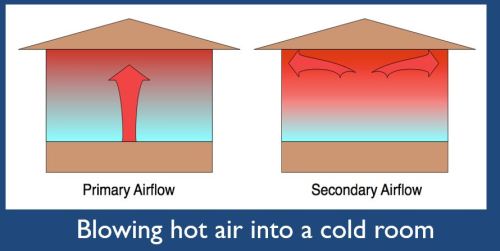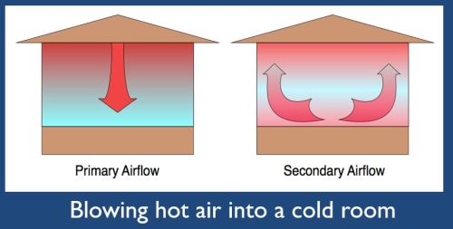 This next image shows what happens when hotter air is down into a colder room.  The primary airflow sends it down toward the floor and the secondary airflow causes it to want to rise back up toward the ceiling.  This promotes mixing and reduces stratification.