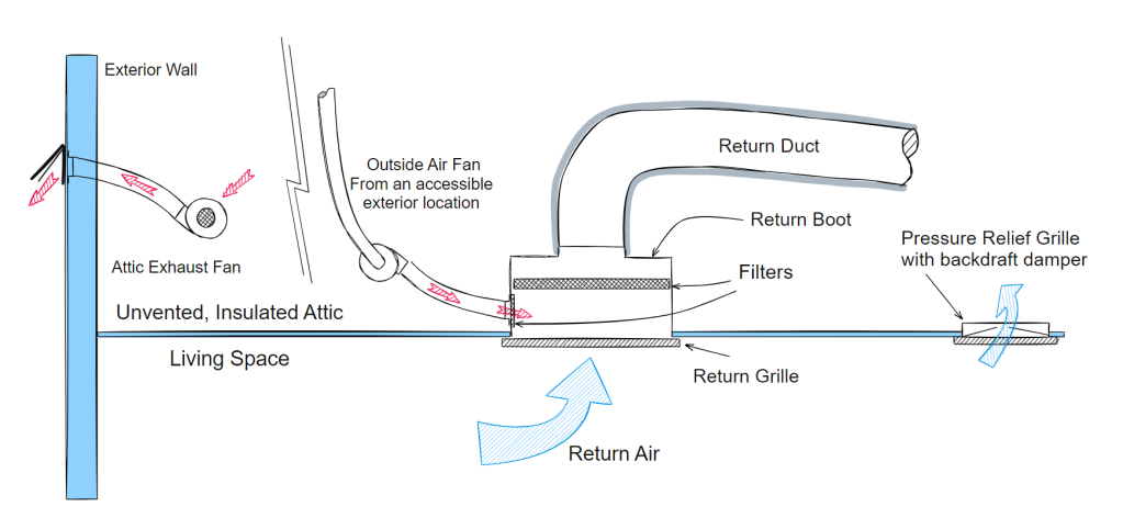 The main reason I proposed this type of system is as an alternative to putting a supply register in the attic, but I think it has a lot of interesting benefits.  The fact that you are pulling a continuous flow of house air across the attic makes it more likely that the attic is close to the house in temperature without wasting supply air.  It’s a balanced ventilation system that avoids the cost, complexity and maintenance of an ERV/HRV.  It provides continuous attic ventilation.  Most people who install ERV/HRVs want to pull air from the bathrooms, not the attic.