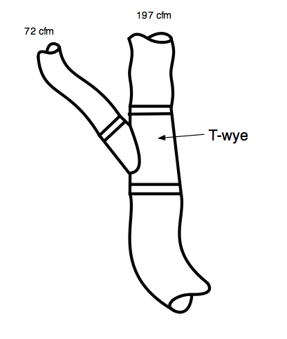 So, the t-wye will need to be a what is commonly referred to as a 10-9-6 sheet metal t-wye. Any contractor who complains about this not being and “off-the-shelf” fitting probably has not done many installs from a carefully designed plan. If they really complain, just tell them to round the odd sizes UP, Making this a 10-10-6 t-wye.